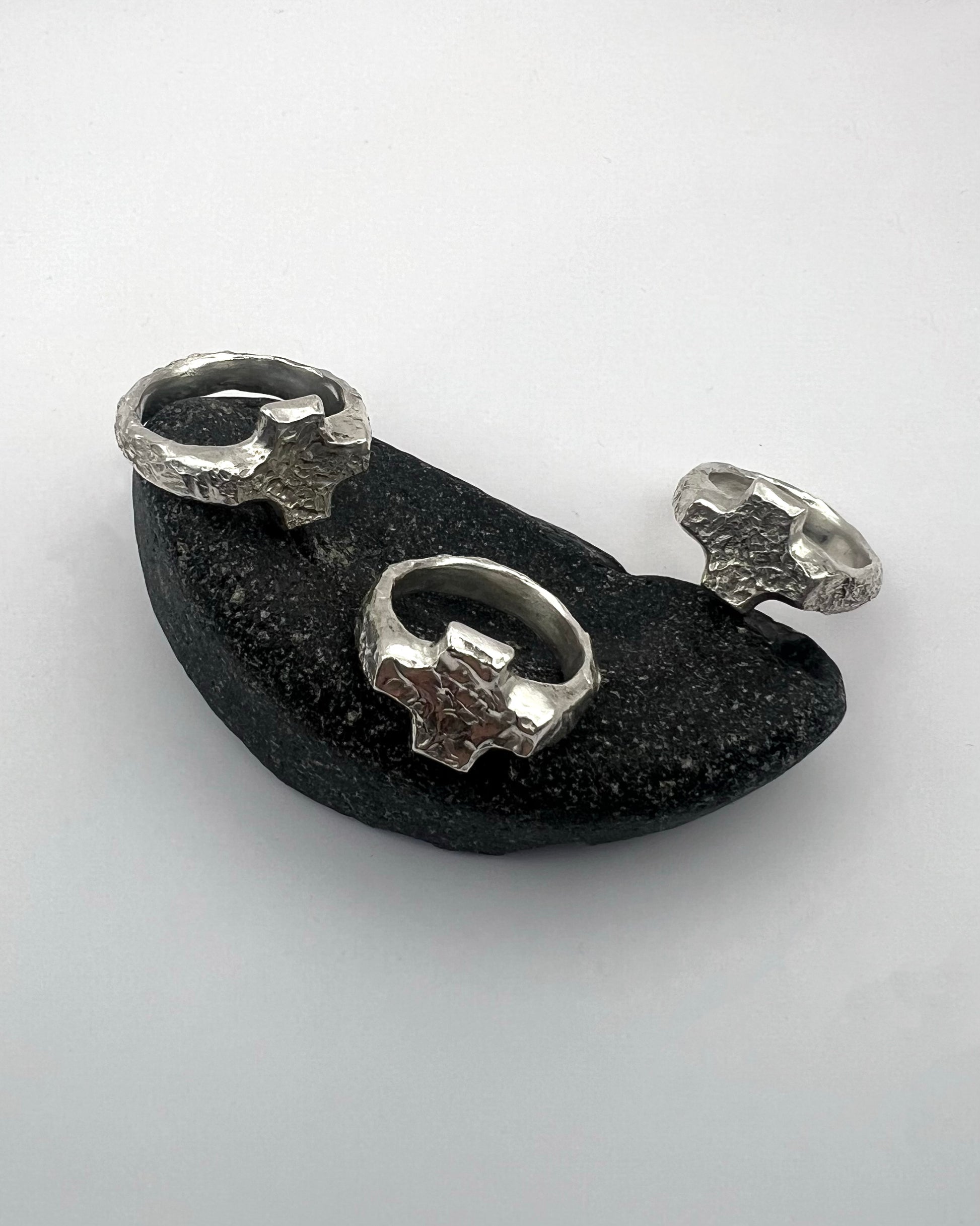 Solid sterling silver ring with a raised textured cross. Each one is individually textured when in wax form so that no two are the same. Hand-finished for an organic feel.
